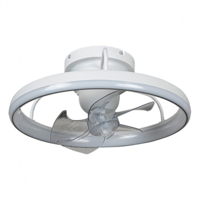 Ανεμιστήρας ορόφης λευκος 30W, 5 πτερύγιων με ενσωματωμένο LED φωτισμο ιδανικο για υπνοδωμάτιο, κουζίνα, καθιστικο. Διαθέτει τηλεχειρισμο 6 σκάλες λειτουργίας χρονοδιακόπτη αντιστροφή φορα για τον χειμώνα, περιστρεφόμενη κεφαλή 360 με δυνατότητα επιθυμητού σημείου αερα. Dimmer αλλαγή χρεώματος φωτισμού 2700 4000 6200.Μοτερ DC.