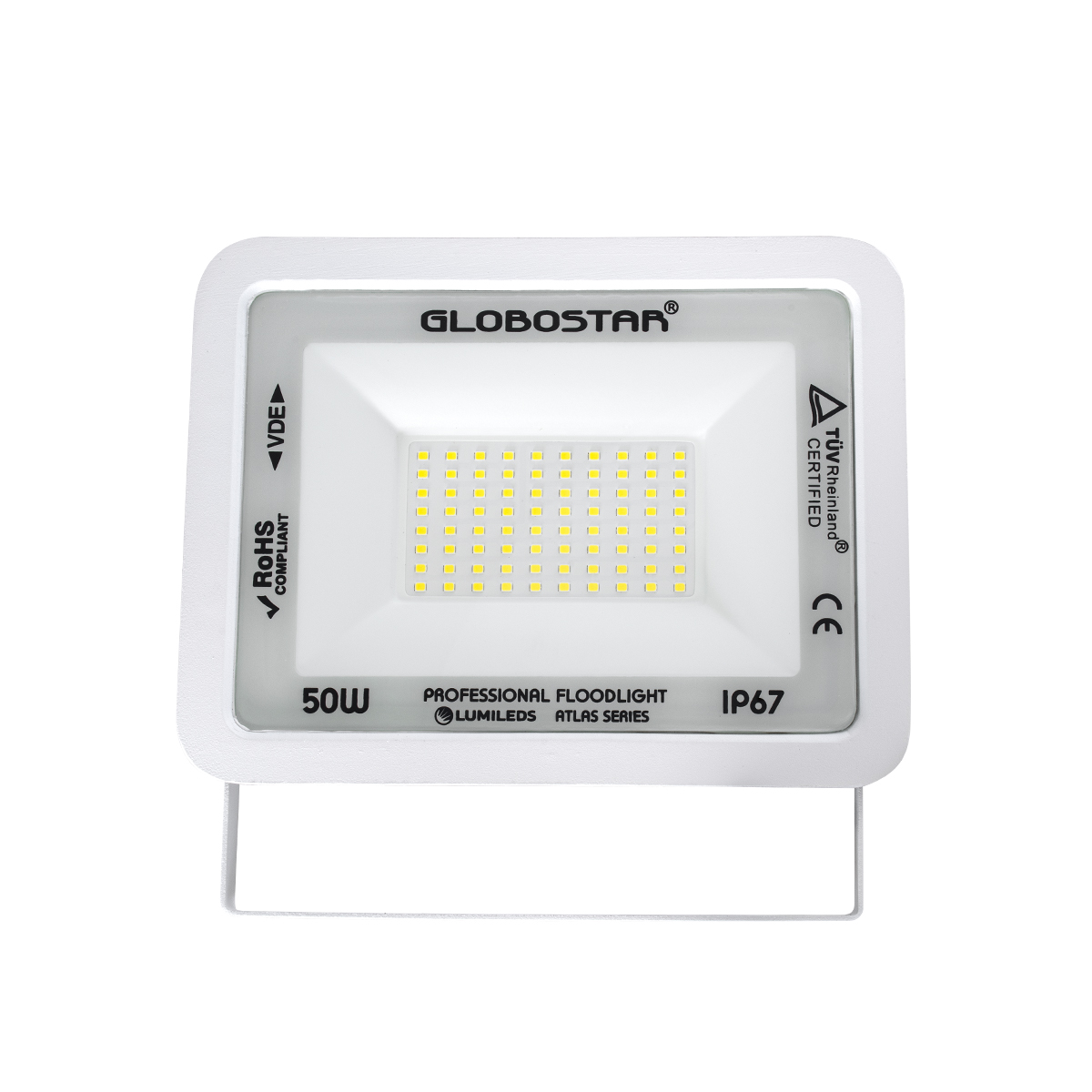 GLOBOSTAR® ATLAS 61419 Προβολέας LED 50W 6250lm 120° AC 220-240V Αδιάβροχο IP67 Ψυχρό Λευκό 6000K – Lumileds SMD Chip – TÜV Rheinland Certified – Λευκό Ματ – Μ21 x Π3.5 x Υ16cm – 5 Χρόνια Εγγύηση